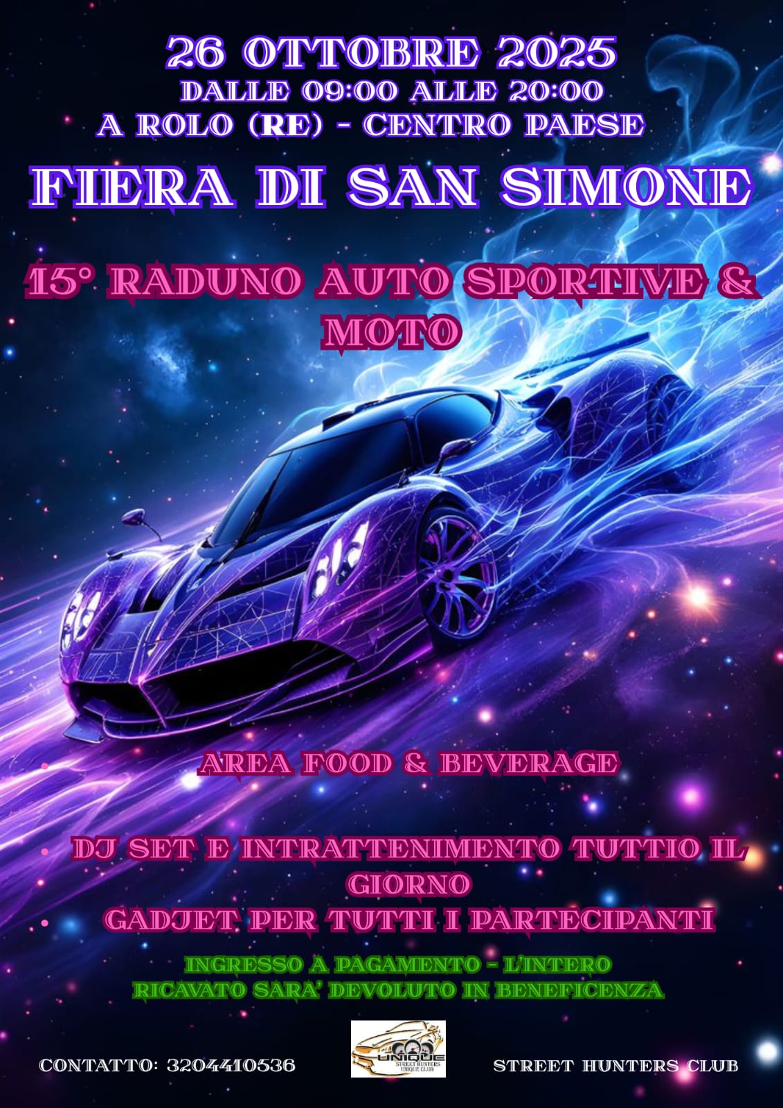 In occasione della tradizionale Fiera di San Simone, il Street Hunters Club ti invita al grande Raduno di Auto Sportive & Moto nel cuore di Rolo (RE)!