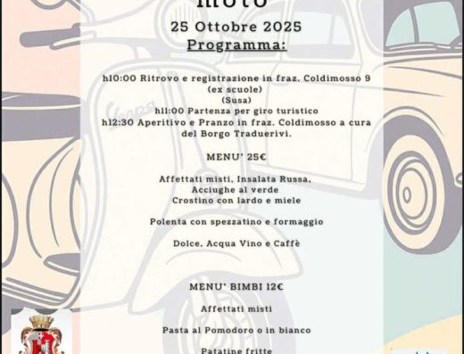 h10:00 Ritrovo e registrazione in fraz. Coldimosso 9 (ex scuole) (Susa) h11:00 Partenza per giro turistico h12:30 Aperitivo e Pranzo ... continua >