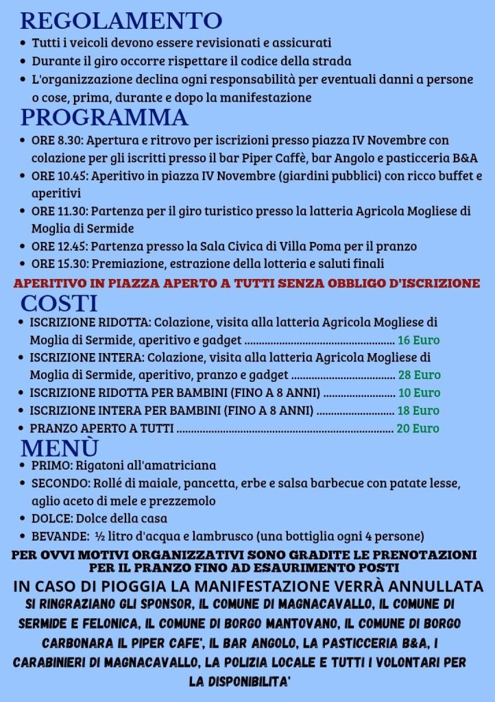 • ORE 12.45: Partenza presso la Sala Civica di Villa Poma per il pranzo