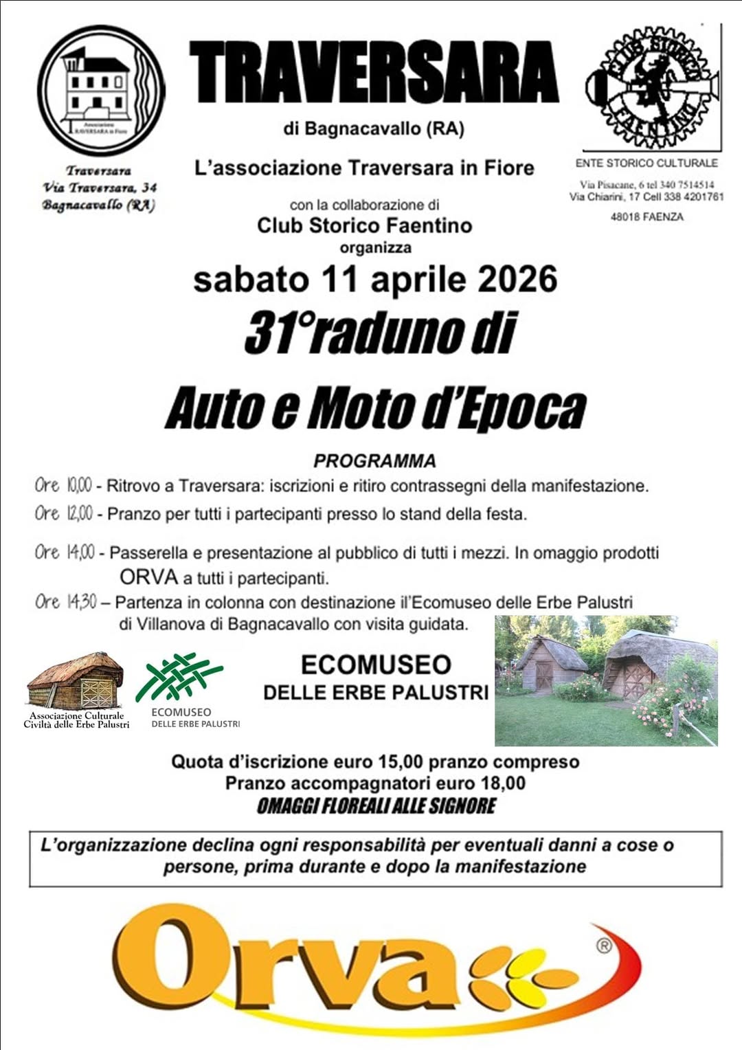 Ore 10,00 – Ritrovo a Traversara: iscrizioni e ritiro contrassegni della manifestazione.