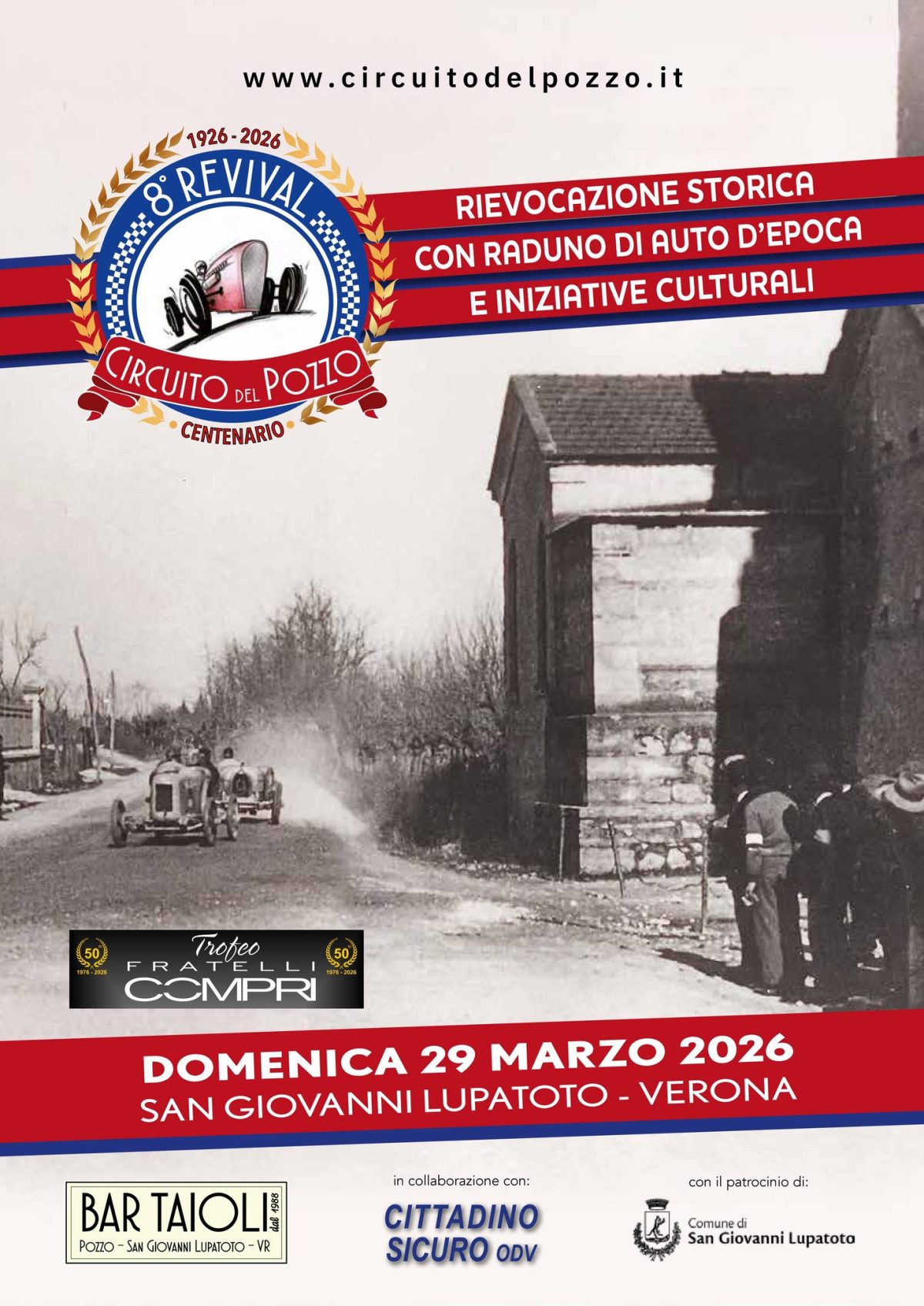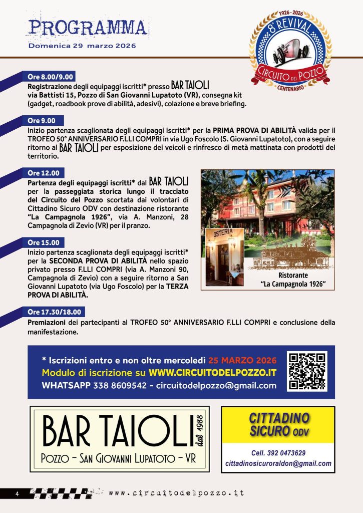 La prima gara sul Circuito del Pozzo si svolse il 21 marzo 1926: per celebrare il Centenario si terrà una serata speciale sabato 21 marzo 2026 – i dettagli verranno comunicati a breve – e messi a disposizione un numero limitato di INVITO OMAGGIO AUTO ANTE 1929 per il raduno di domenica 29 marzo.