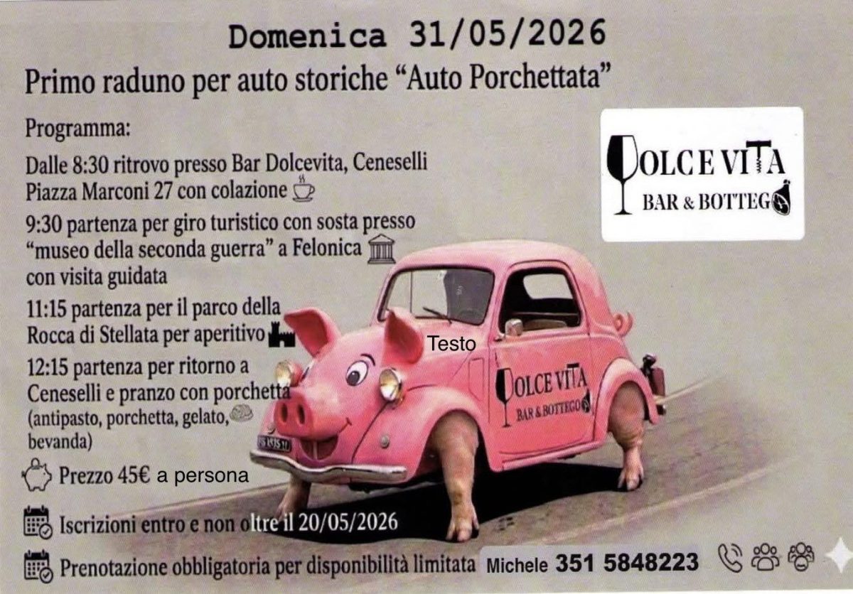 12:15 partenza per ritorno a Ceneselli e pranzo con porchetta (antipasto, porchetta, gelato, bevanda)
