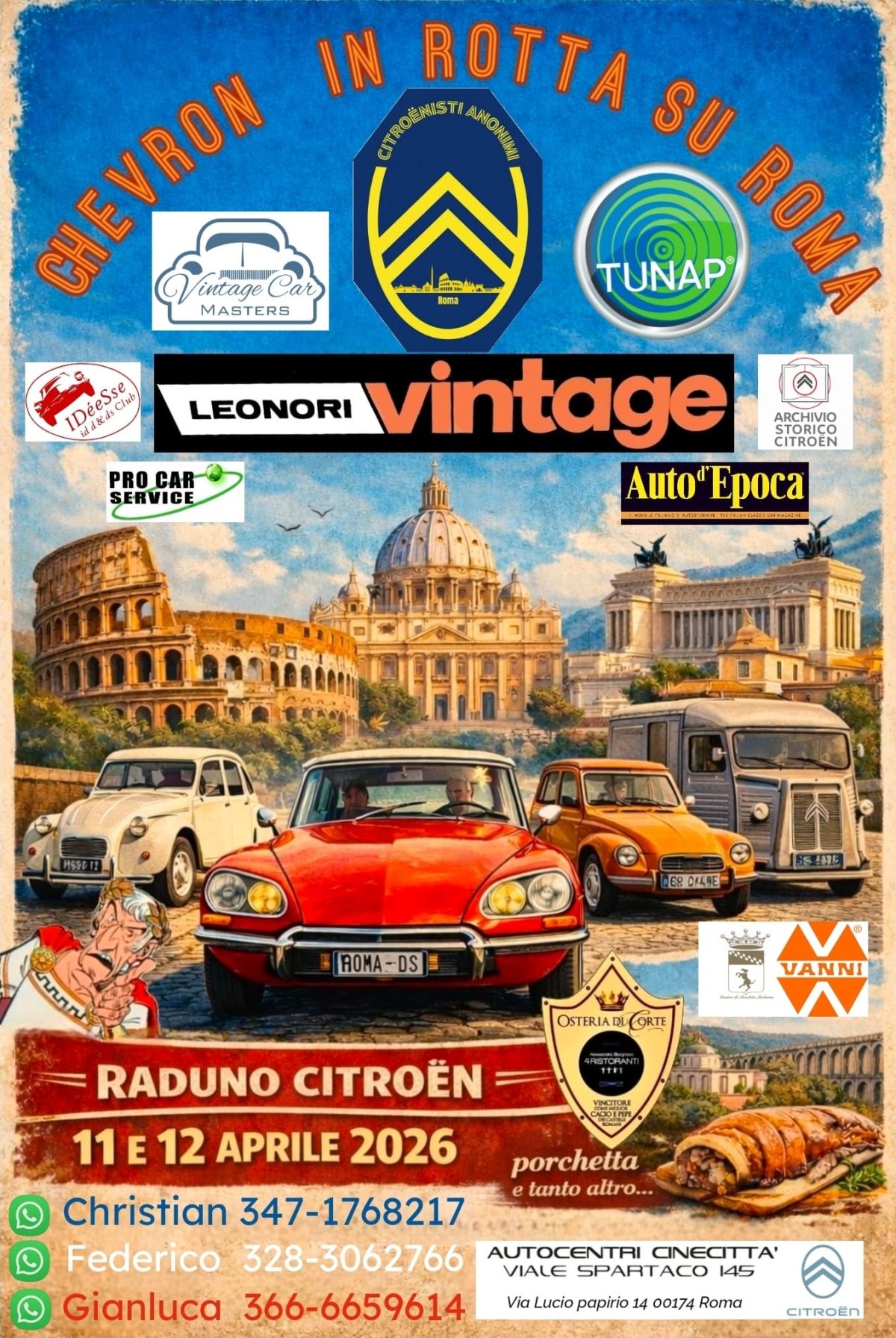 Una selezione di vetture sarà protagonista di una suggestiva fusione tra motori e cultura: auto storiche, arte e simboli della romanità si incontreranno in un percorso evocativo dedicato alla bellezza eterna di Roma. Grazie agli accordi presi e al contributo dei nostri sponsor, siamo riusciti a ridurre la quota di partecipazione a persona.