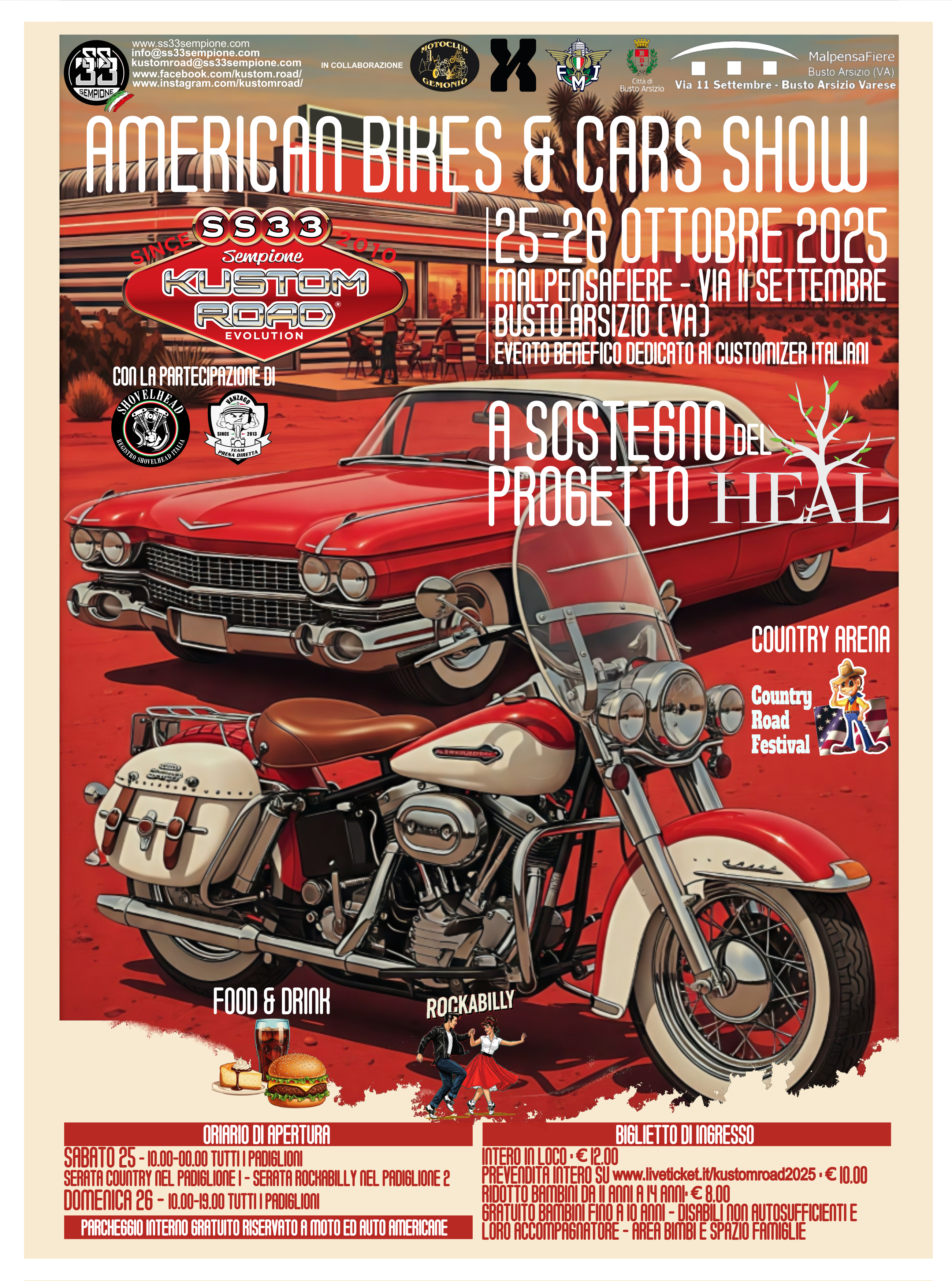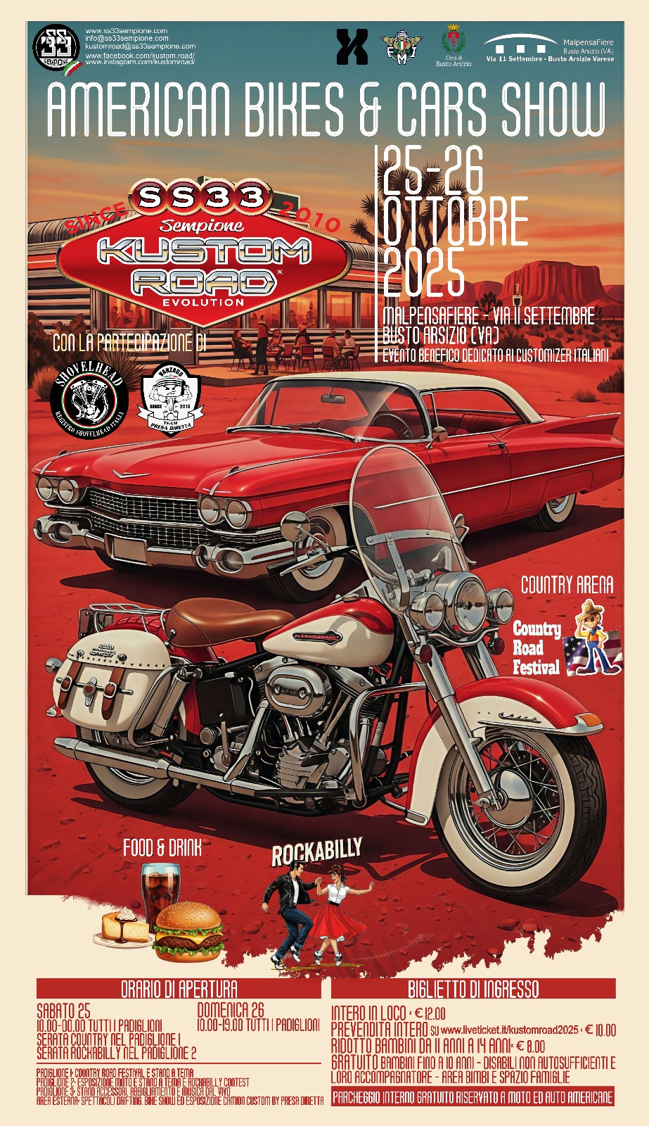 Torna a Busto Arsizio (VA), nello storico polo fieristico di MalpensaFiere – Centro Fiere Congressi ed Eventi, il 25 e 26 ottobre, la quattordicesima edizione di Kustom Road, l’evento benefico organizzato dal Motoclub SS33 Sempione.