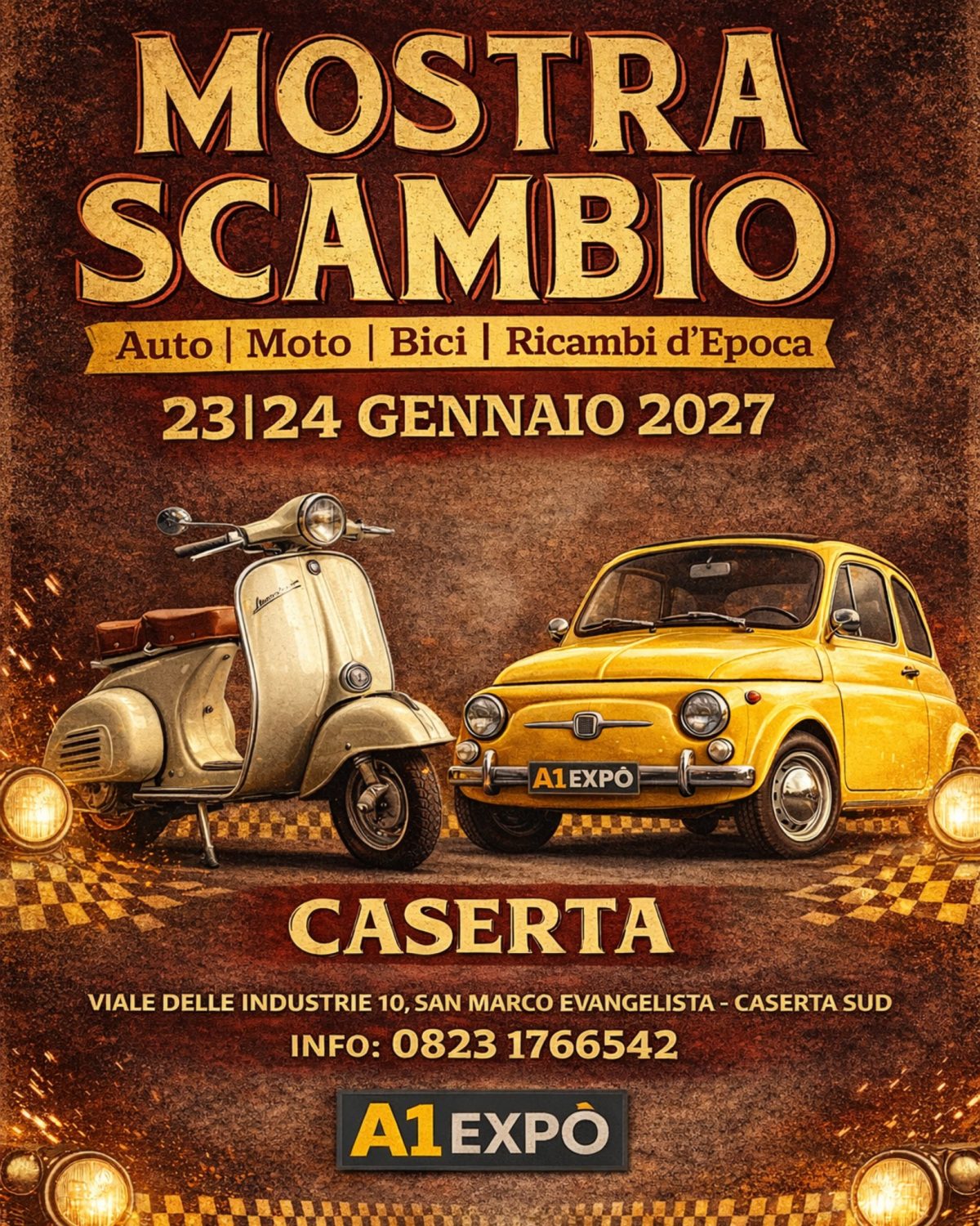 Il 23 e 24 gennaio 2027, nel moderno centro espositivo A1Expò di Caserta, va in scena la Mostra Scambio Auto, Moto e Ricambi d’Epoca, un evento dedicato al fascino senza tempo dei veicoli storici e all’universo del collezionismo motoristico.