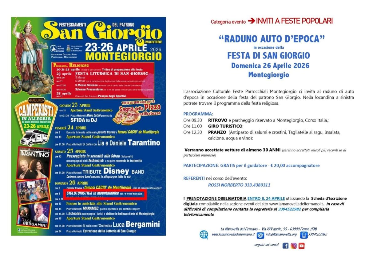 L’associazione Culturale Feste Parrocchiali Montegiorgio ci invita al raduno di auto d’epoca in occasione della festa del patrono San Giorgio. Nella locandina a sinistra potrete trovare il programma della festa religiosa.