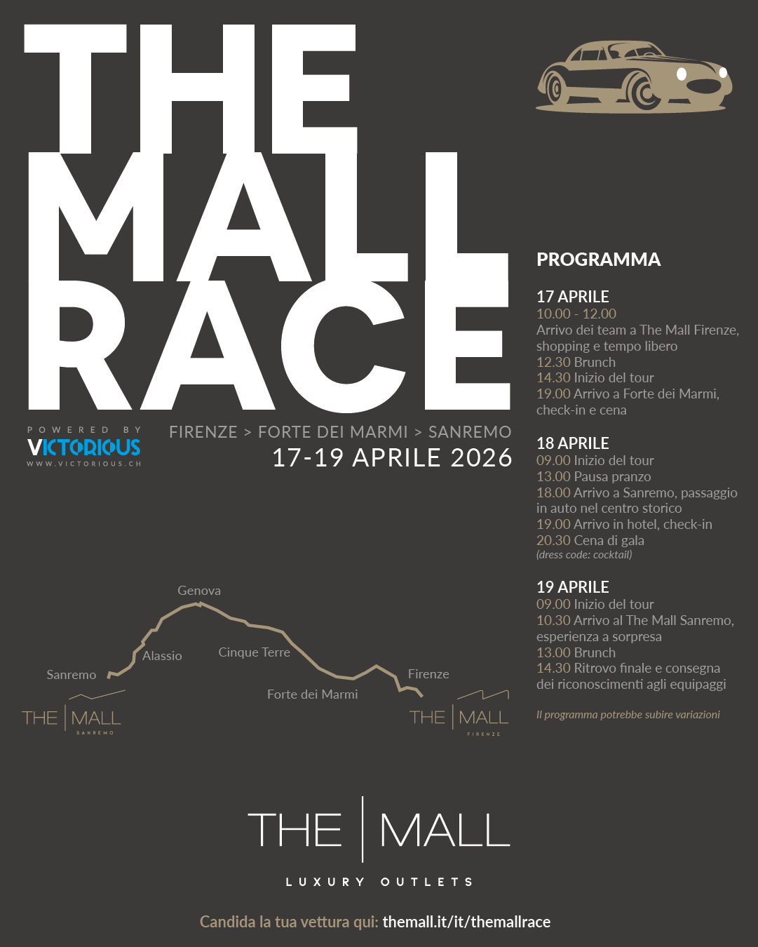 Dopo il successo della collaborazione con la 1000 Miglia e l’apertura della Dallara Lounge, The Mall Luxury Outlets consolida il suo legame con il mondo dei motori proponendo un’esperienza unica: non una gara, ma un viaggio esperienziale dedicato al piacere della guida, all’incontro tra stile, moda e lifestyle.
