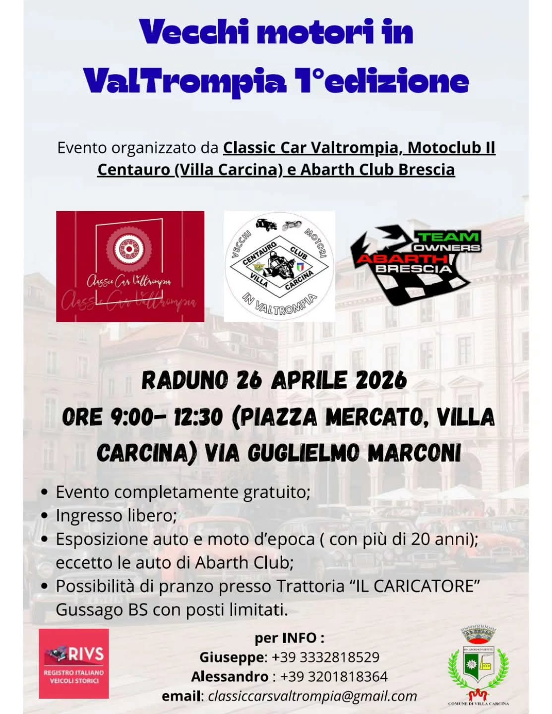 Vi aspettiamo numerosi al nostro evento che si terrà il 26 Aprile a Villa Carcina, nella nuova piazza del mercato dalle 8 fino alle ore 12.30 l ingresso é libero e gratuito per tutte le auto e moto storiche e youngtimer, con almeno 20 anni di età, eccetto per i possessori delle Abarth 500/Grande Punto/124. Per chi fosse interessato al pranzo, che é opzionale e staccato dal raduno statico, scriveteci in DM per info. Non mancate, vi aspettiamo