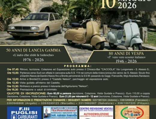 Ore 07,45: Ritrovo, Iscrizione, Colazione ed Esposizione auto presso il Chiosco-Bar “CACCIOLA” Via Lungomare – S. Alessio S.; Ore 10,00; ... continua >