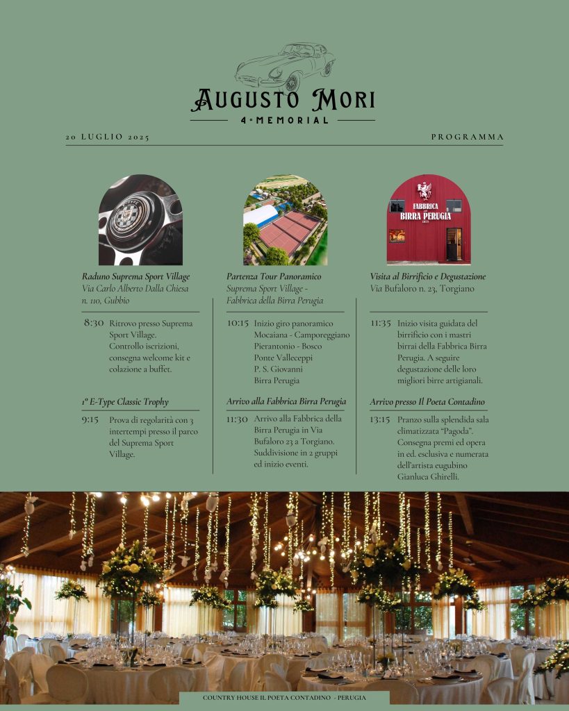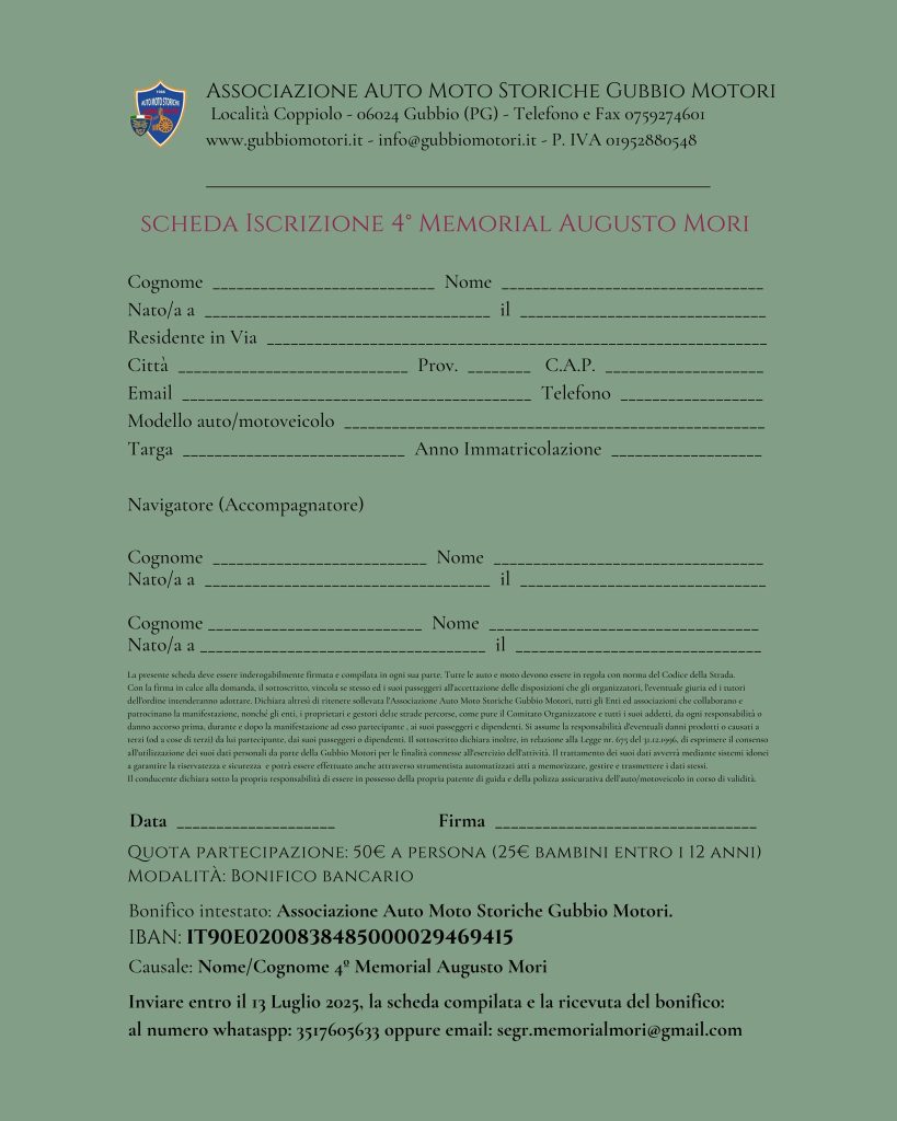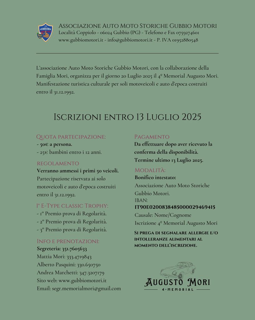 L’associazione Auto Moto Storiche Gubbio Motori, con la collaborazione della Famiglia Mori, organizza per il giorno 20 Luglio 2025 il 4° Memorial in onore del noto imprenditore eugubino Augusto