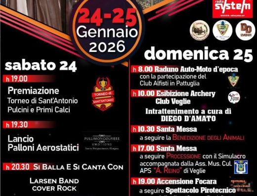 sabato 24 h 19.00 Premiazione Torneo di Sant’Antonio Pulcini e Primi Calci h 19.30 Lancio Palloni Aerostatici h 20.30 SI ... continua >